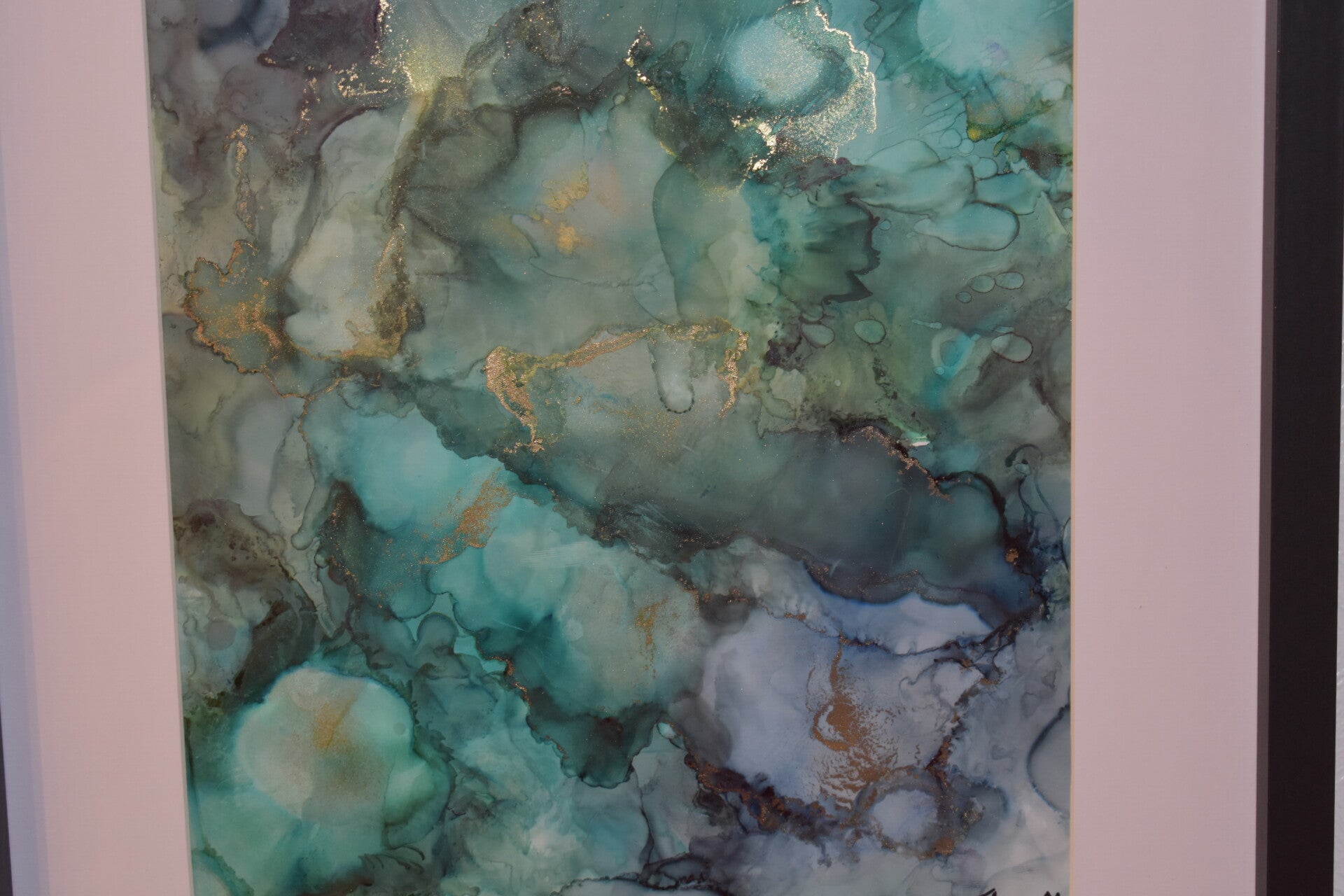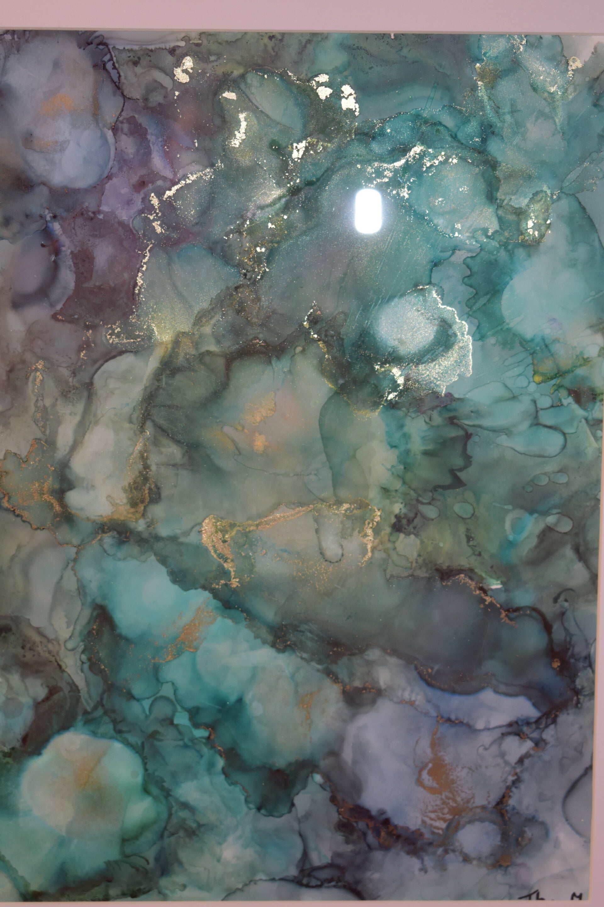 Cette pièce est une exploration subtile des transparences et des textures obtenues grâce à l'utilisation d'encres à l'alcool. Les teintes dominantes oscillent entre des verts émeraude, des bleus aquatiques et des touches de gris nuageux, offrant un effet marbré rappelant des paysages célestes ou aquatiques. Des reflets dorés, obtenus par l’application de feuille d’or ou de pigments métalliques, viennent illuminer l’œuvre, ajoutant une richesse texturale et visuelle.